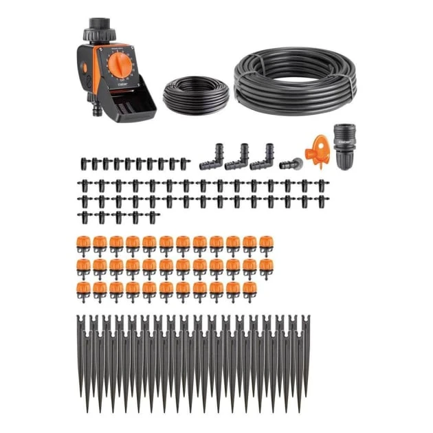| Componentes del kit | 35 goteros ajustables de 0-40 L/h, 35 piquetes de soporte para tubo de suministro, 35 enlaces de dos vías de 1/4", 10 tapones finales de 1/4", 3 enlaces acodados de 1/2", programador de riego de una vía Aquauno Logica, 15 m de tubo principal de 13-16 mm (1/2"), 20 m de tubo de suministro de 4-6 mm ( 1/4"), tapón final de 1/2", enlace automático y perforador |
