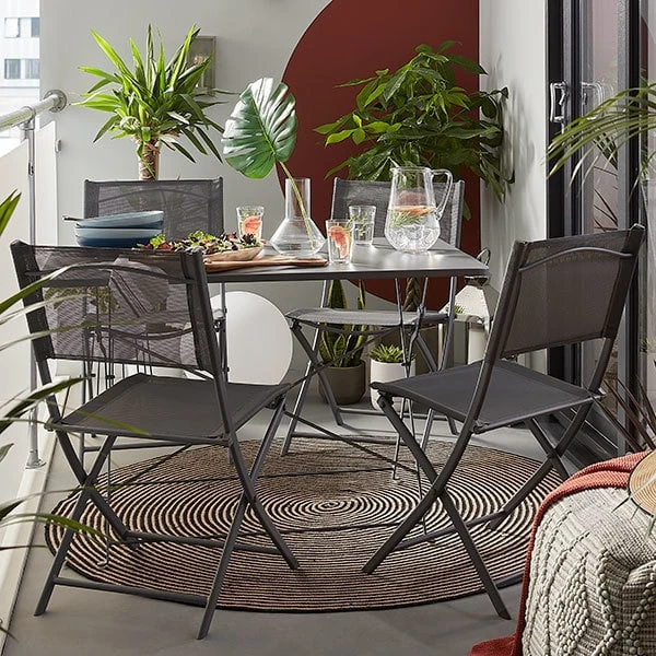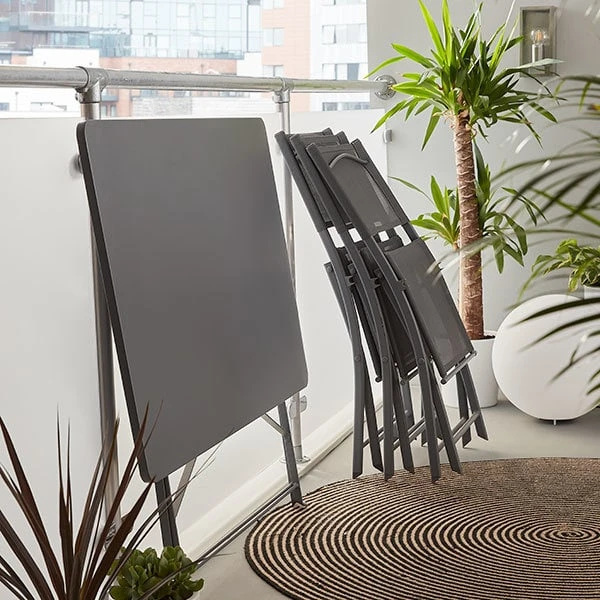 Mesa de jardín plegable en color gris mate. Fabricada en acero, resistente para exterior y con 5 años de garantía.Esta mesa rectangular de exterior de nuestra gama Saba, fue diseñada con un aspecto bistró y es ideal para espacios reducidos. Tiene capacidad para 4 personas, es muy ligera y plegable, por lo que puede guardarla fácilmente cuando sea necesario.Puedes combinarlo con diferentes colores de nuestras sillas Saba para una apariencia única y elegante.