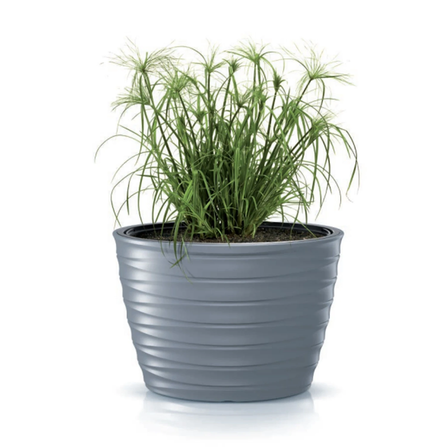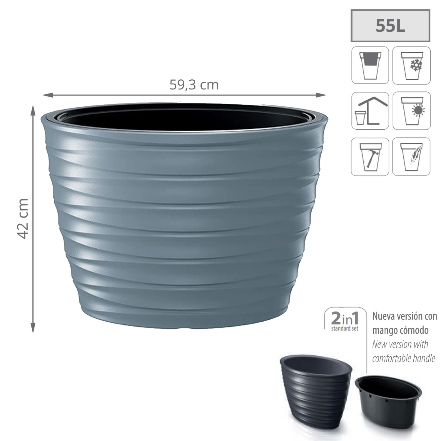 Set 2 en 1: macetero que incluye un depósito interior adaptado que reduce la cantidad de tierra necesaria.